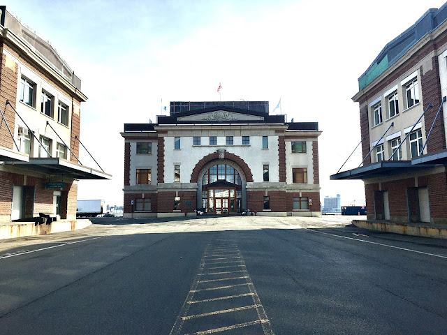 Over the weekend, with a desire to feel the ocean breezes of Boston Harbor, I headed to that section of the city where I spent the night at the Seaport Hotel, not a bargain, but still, it's peak tourist season and the hotel was offering a special deal. Because the coffee machine in the room was not working, I headed down to the lobby where I realized that it was a good time to take a walk, coffee cup in hand. The beautiful morning light was beckoning. On that early morning harbor walk, I stumbled upon a rather impressive set of buildings reminiscent of Ellis Island (and from the same era --1905). I walked between them to the building at the far end where two women came out of their cars and opened the door to that last building. They looked friendly.
